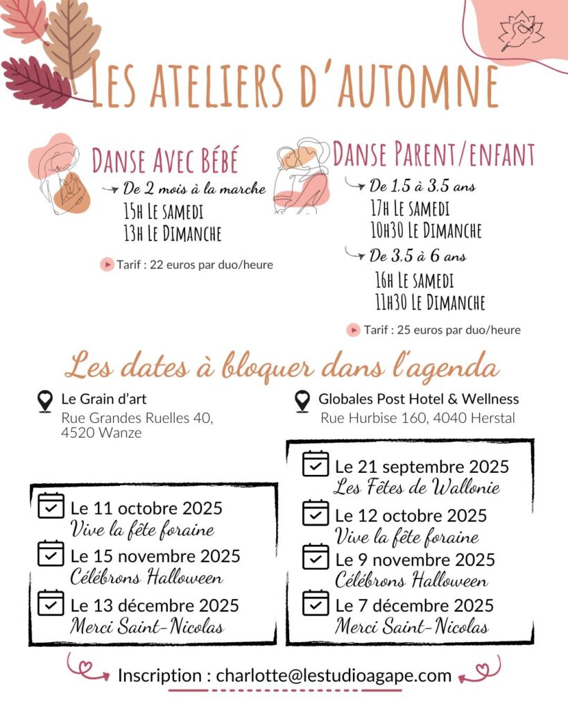 Les ateliers de danse parent/enfant de 1,5 à 3,5 ans se déroulent à 17h les samedis et à 10h30 les dimanches. Les ateliers de danse avec bébé sont au prix de 25 euros par duo.