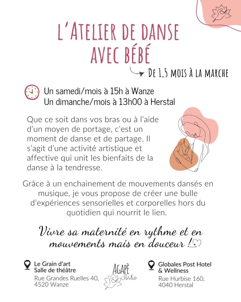 Les ateliers de danse avec bébé ont lieu à 15h les samedis et à 13h les dimanches. Les ateliers de danse avec bébé sont au prix de 22 euros par duo.