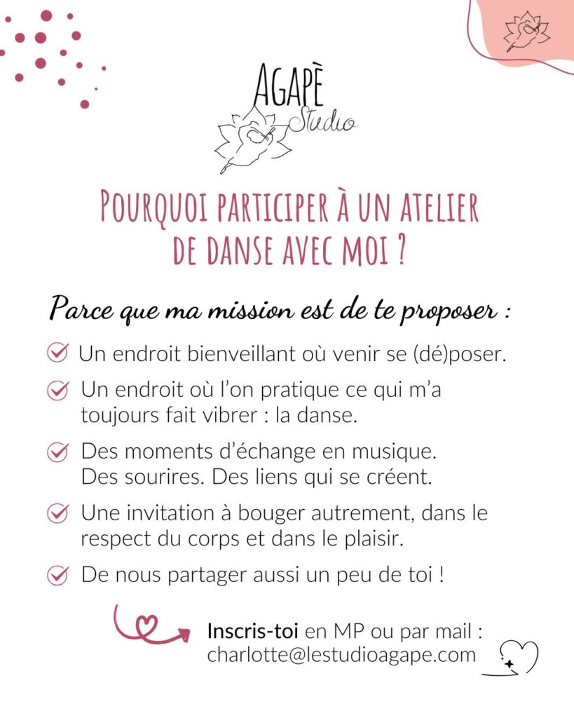 Pour réserver votre place, choisissez le(s) créneau(x) que vous souhaitez réserver et écrivez moi un MP ou un mail à l’adresse suivante : charlotte@lestudioagape.com.